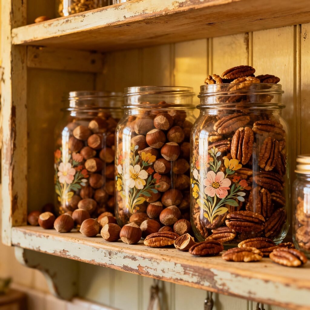 Candle jars, pasta jars, jam jars – all cute once cleaned. Use for flowers, cotton pads, spices, whatever. I actually use a lot of old „Weck“ preserve glasses from my grandma as storage glasses for my dried goods like rice, grains and nuts.