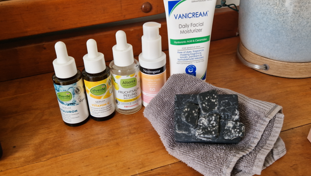 In my latest Youtube Video I don’t show a full “washing my face” routine because the light in my bathroom is terrible. But I show you the products I use and here I´ve written down exactly what I do.
